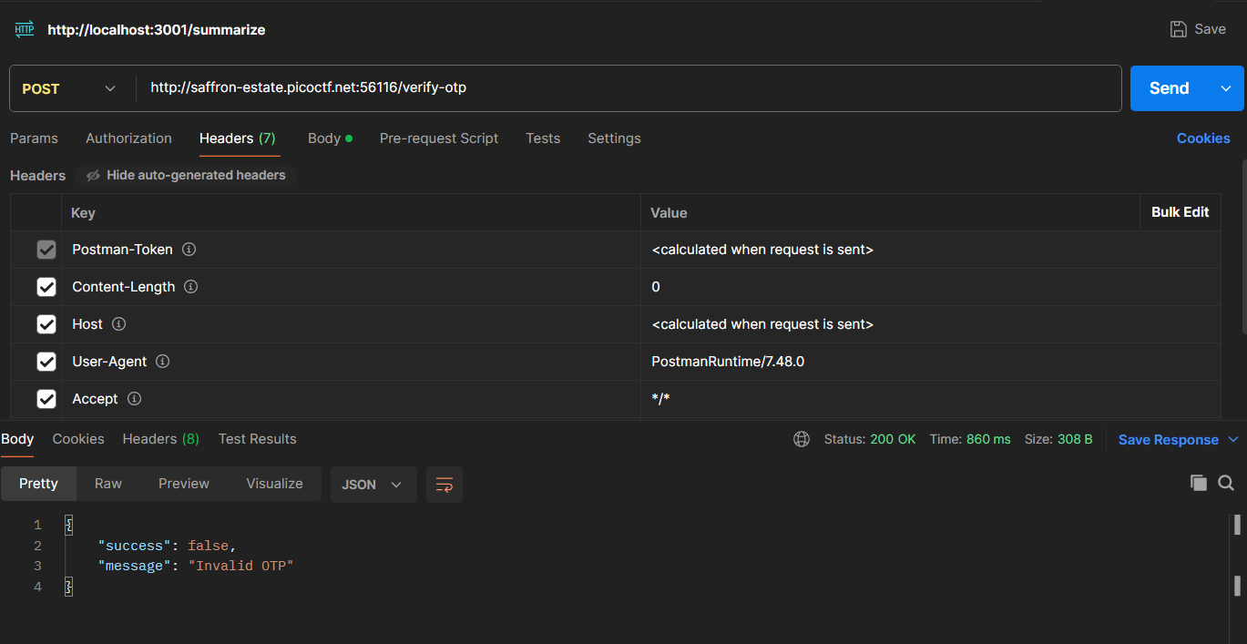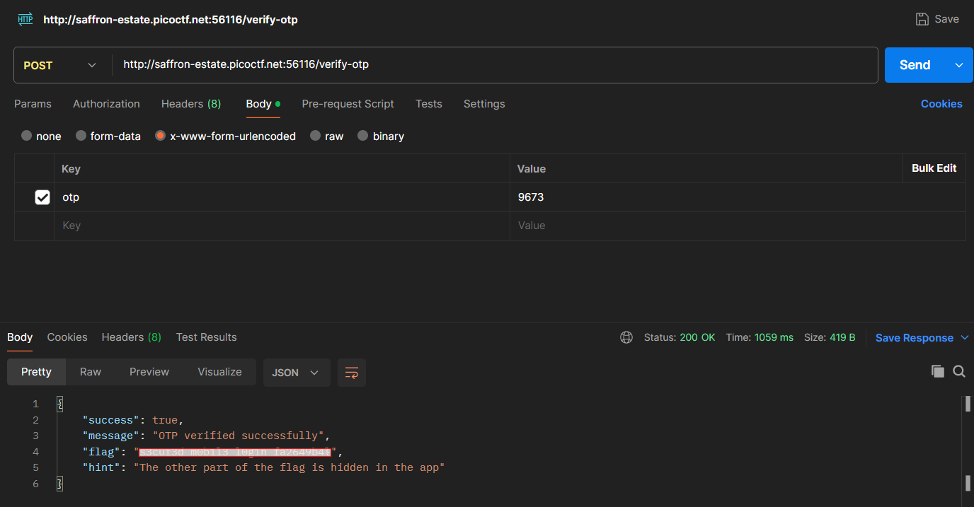 Secondary step:The server endpoint verify-otp accepted POSTs and returned a JSON containing the first half of the flag — you can query the API directly with Postman or curl once you know the OTP. -